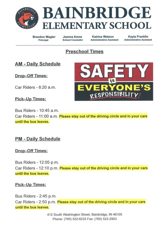 We have staggered the pick-up and drop-off times for car riders and bus riders for safety purposes, and we need to stick to these times. Our bus drivers need for the preschool driving circle to be clear of vehicles and of people while they are picking up and dropping off children for everyone's safety.